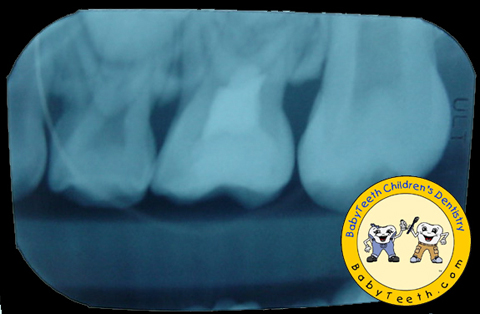 Description: Large decay on 2nd primary molar (on the upper jaw) of a 7-year old (see top photo). Due to the large size of cavity and penetration of decay into the pulp chamber (where nerve and blood vessels are located), a pulpotomy (similar to a root canal treatment) was performed (see middle photo). Both aesthetics and function have been beautifully restored with a BabyTeeth Direct Onlay (see bottom photo).